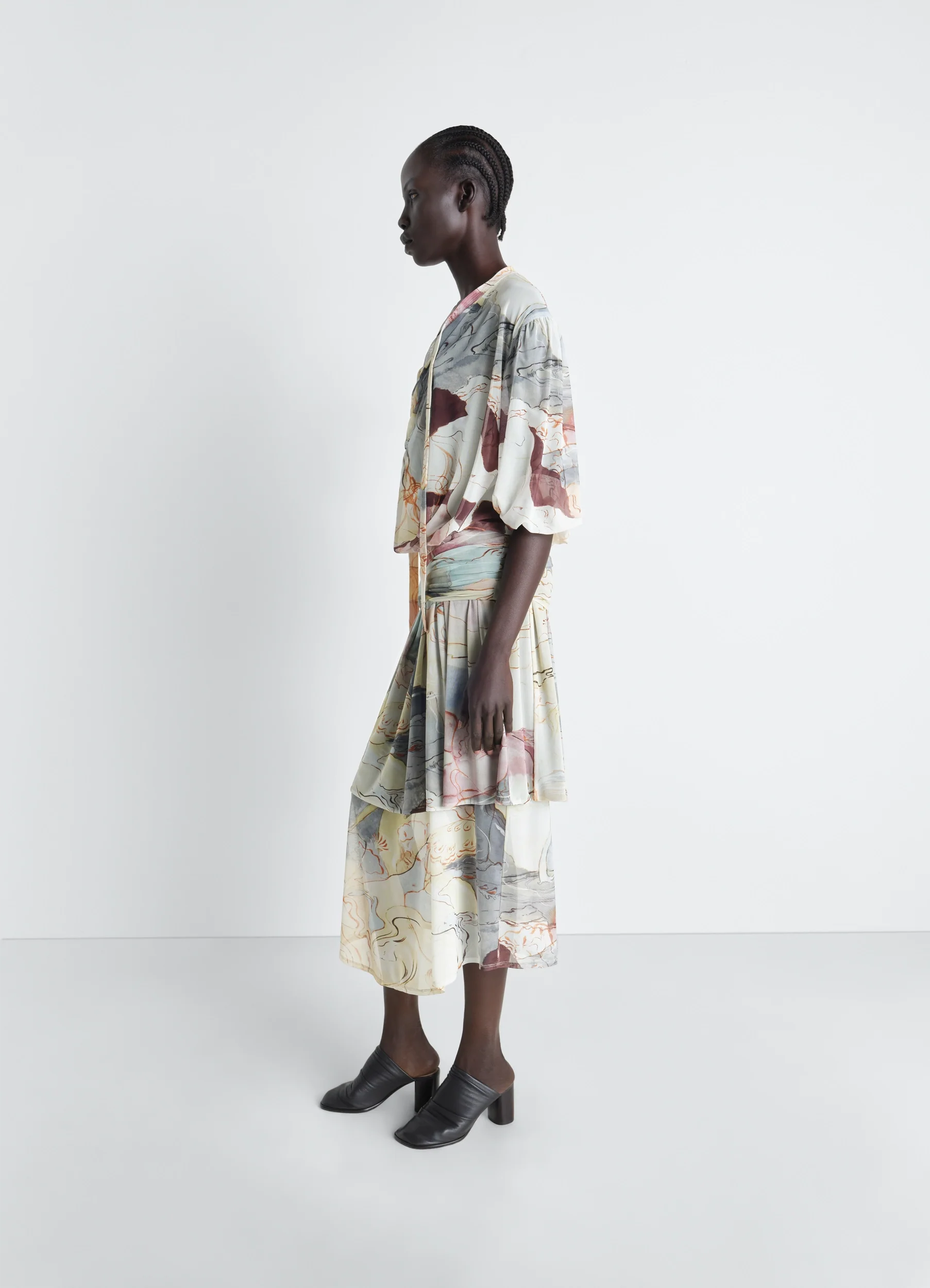 Delicacy is highlighted through sophisticated fluidity in this dress that plays with volumes, lengths, and contrasts. Cut from transparent mesh, it features draping that sits low on the waist for a light, elegant two-in-one effect.