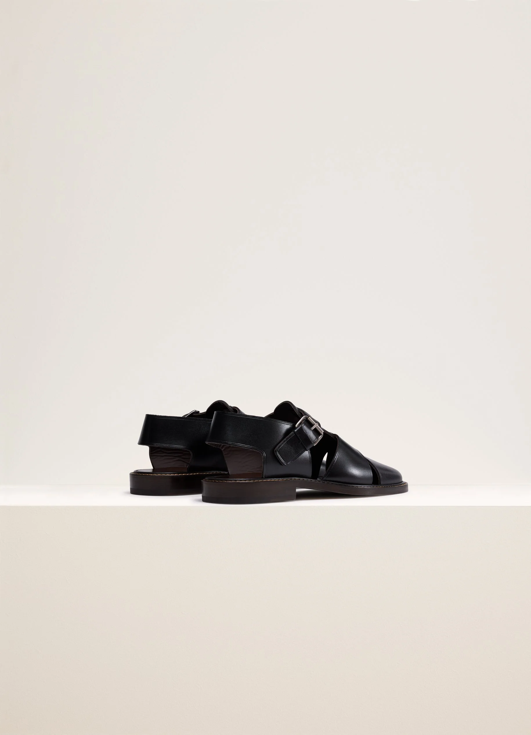 These sandals are part of the LEMAIRE family of footwear. Introduced during the Spring-Summer 2023 collection, they are now offered for both men and women. Inspired by fisherman sandals, these shoes are made of smooth vegetable-tanned cow leather with a shiny finish. They feature a layered construction of two straps woven through structured uppers, an adjustable buckled strap on the ankle, square toes and topstitched soles.