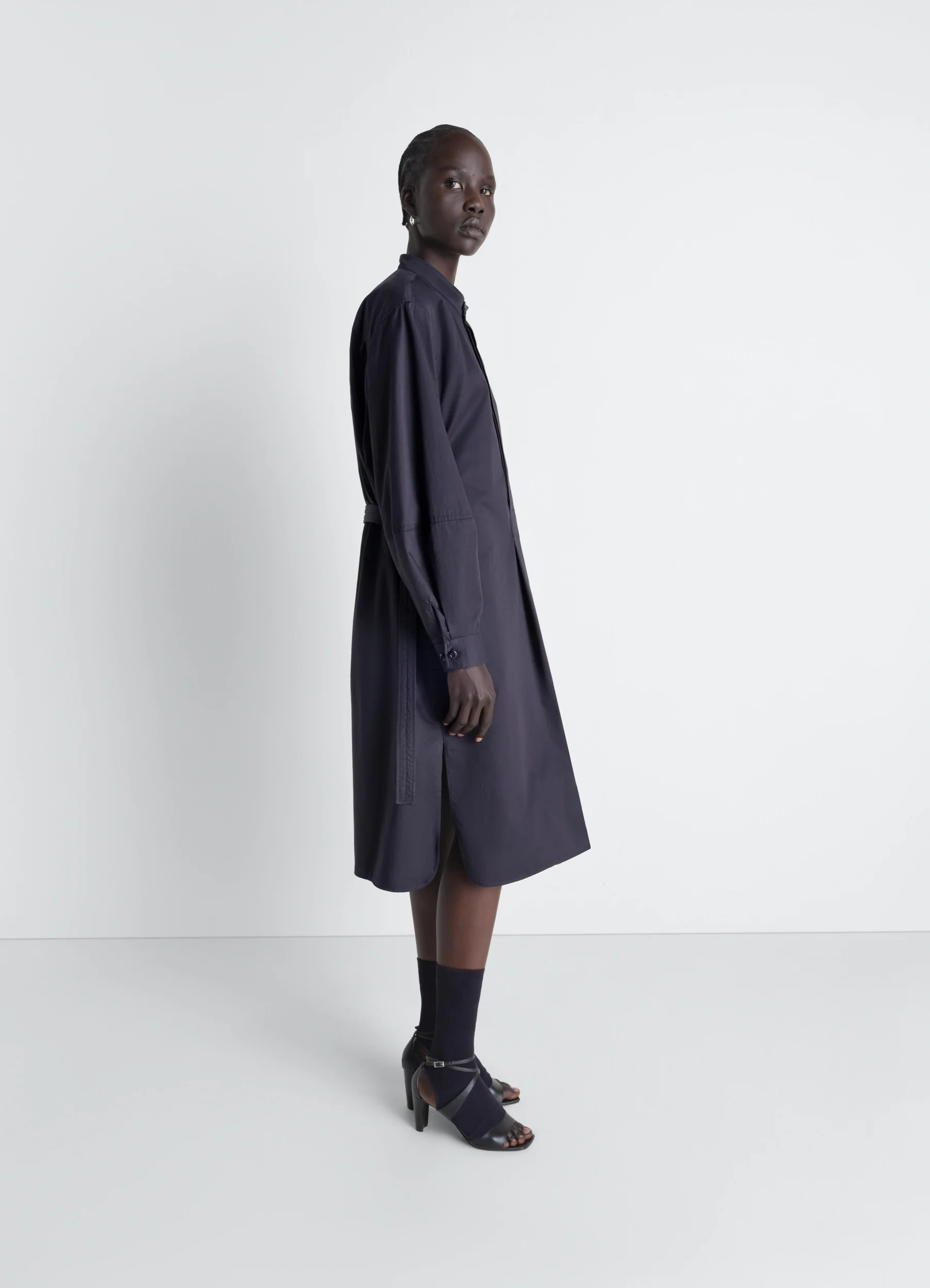 This streamlined shirtdress adopts feminine, elegant details. The model is crafted from delicate cotton satin.