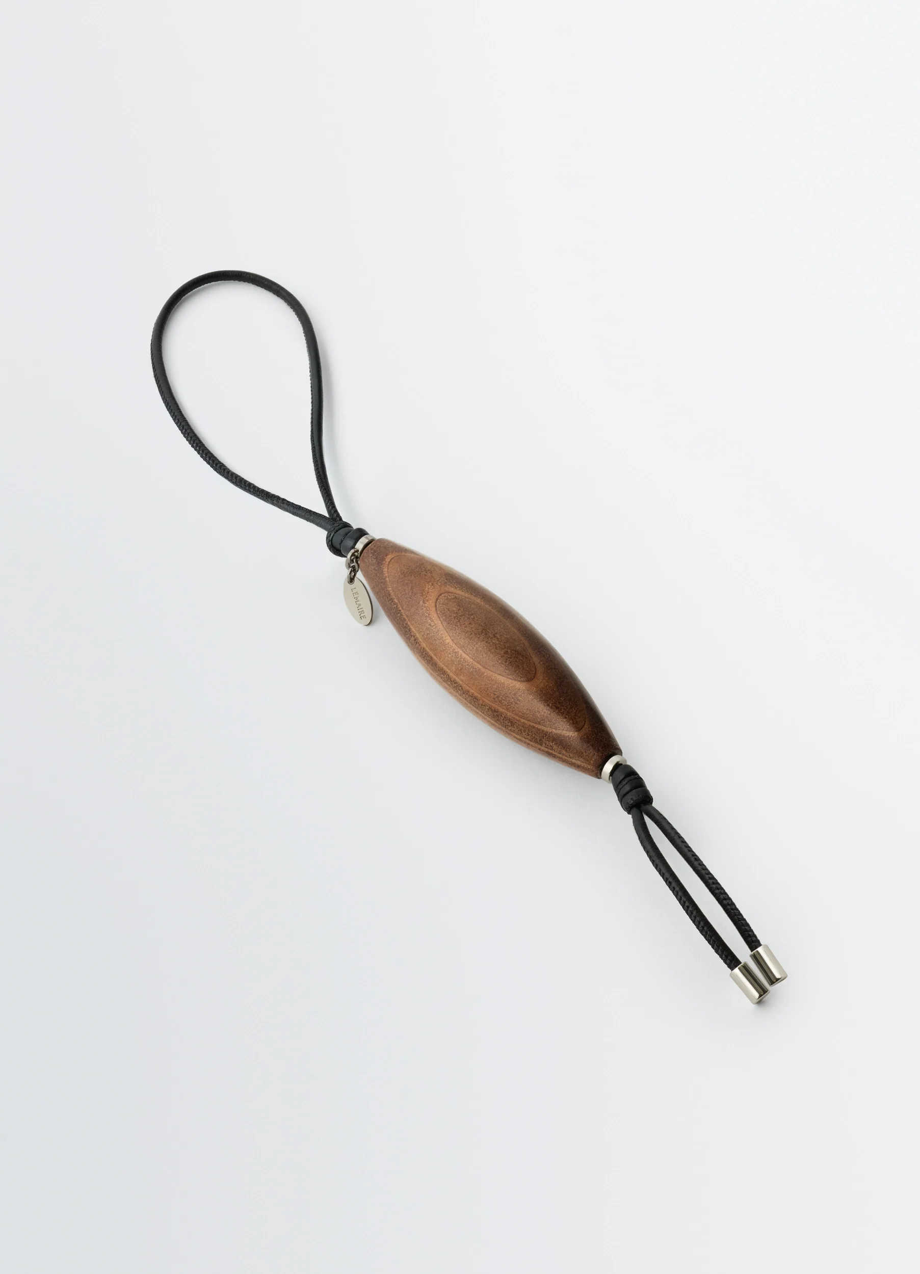 A subtle and signature Lemaire accessory, the Olive bag charm in leather on a cord clips easily to any bag using its carabiner.
