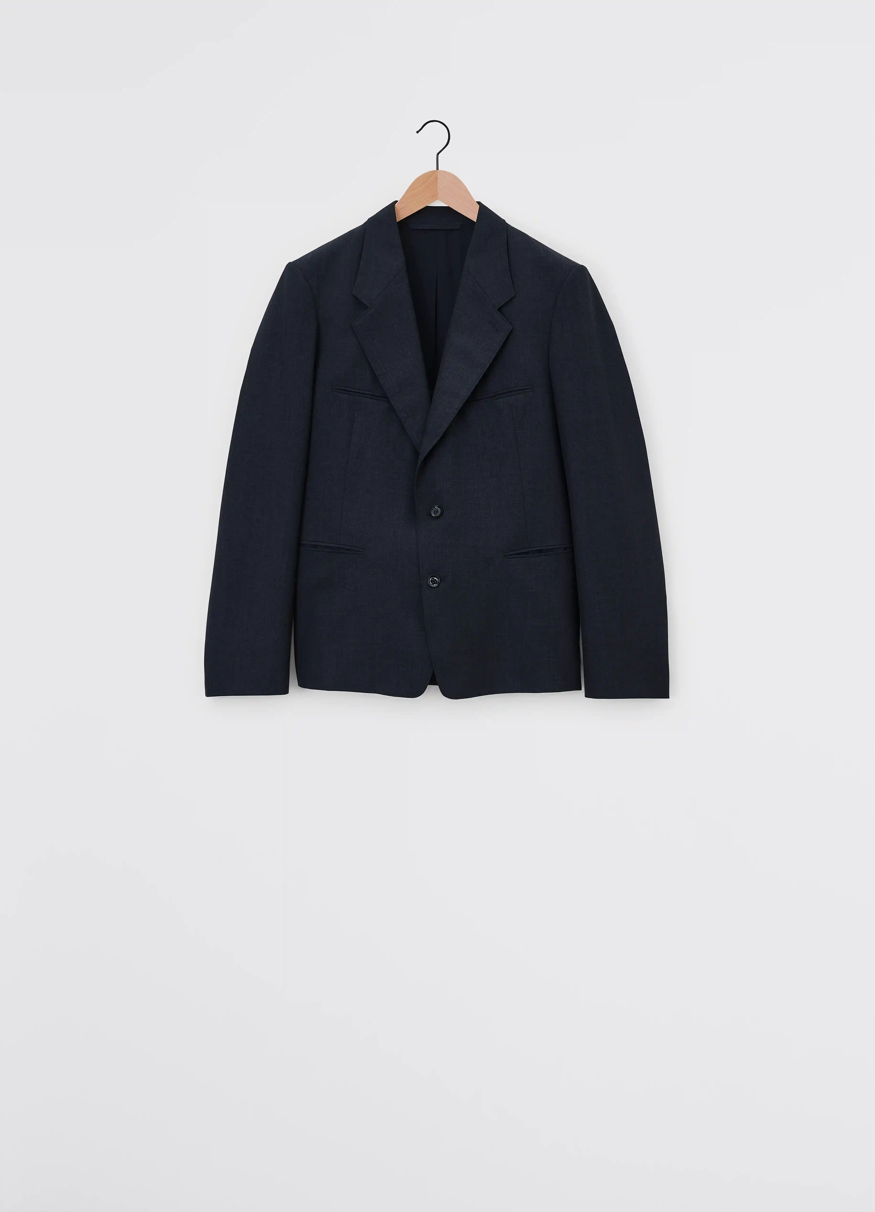 This jacket is a new addition to the tailored LEMAIRE wardrobe. It is made of poly-wool woven into a mélange twill, with a dense yet supple hand for fluid tailoring. This single-breasted silhouette has two buttons at the lower front, an open and relaxed collar with a single lapel, four jets pockets and two darts structuring the waist. Other tailored details include a slightly curved sleeve for practicality and two inside pockets.